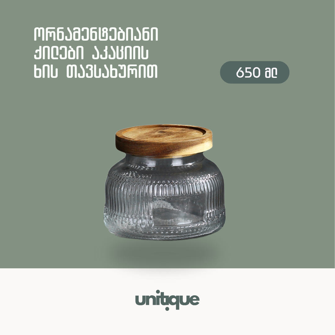 მინის ქილა ორნამენტებით (ზოლებით), აკაციის ხის თავსახურით 650მლ